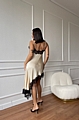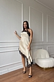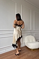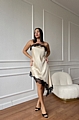 Αναδείξτε το στυλ σας με αυτό το ασύμμετρο σατέν φόρεμα σε μπεζ απόχρωση, διακοσμημένο με κομψή μαύρη δαντέλα.