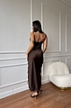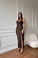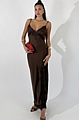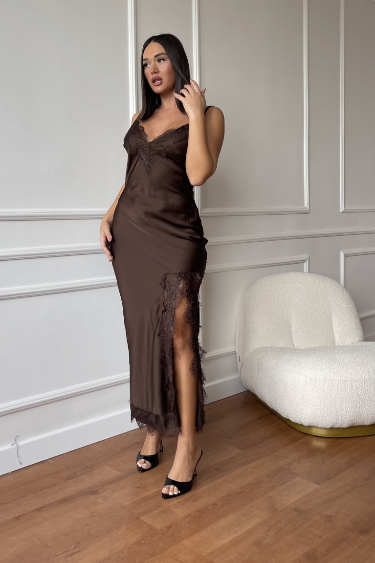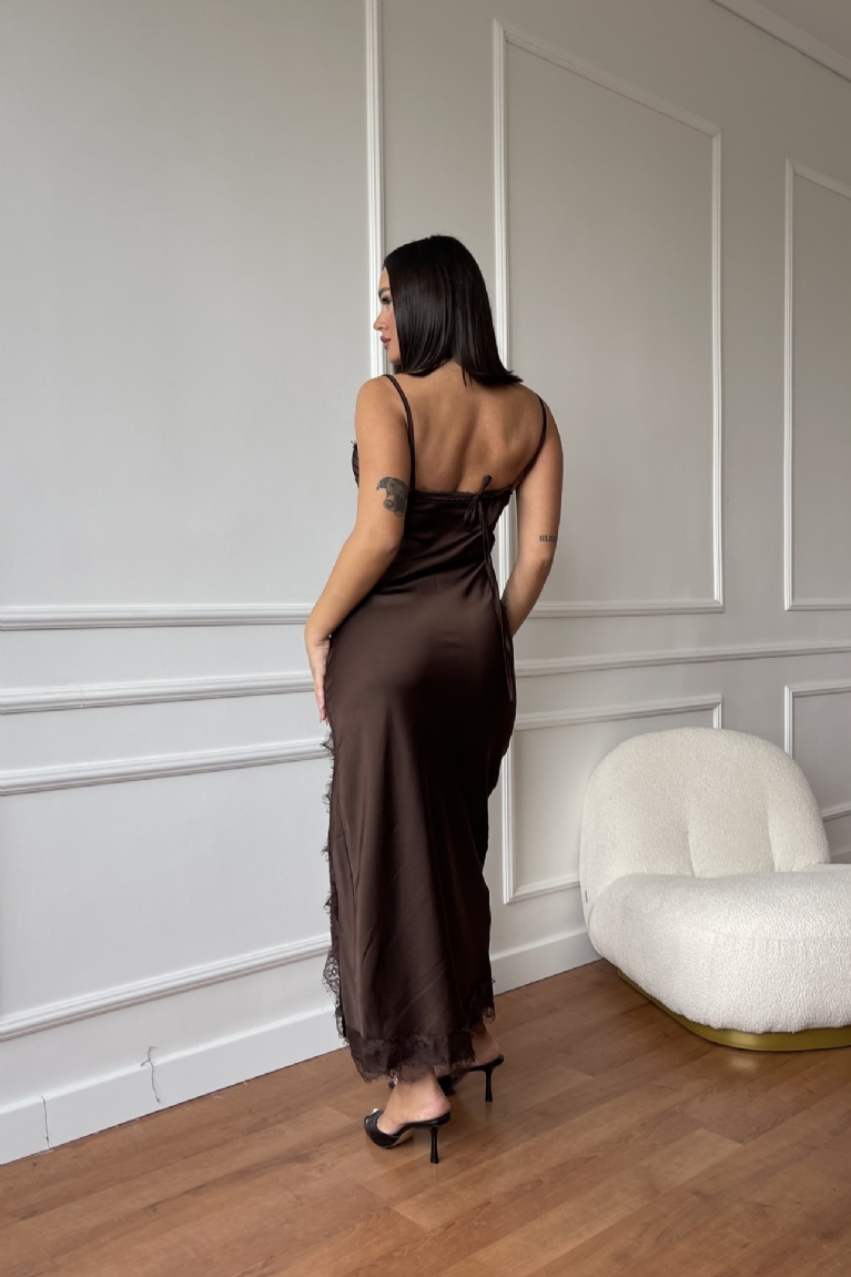 Αναδείξτε το στυλ σας με το μακρύ φόρεμα τιράντα σε καφέ απόχρωση, διακοσμημένο με εκλεπτυσμένη δαντέλα και εντυπωσιακό σκίσιμο.