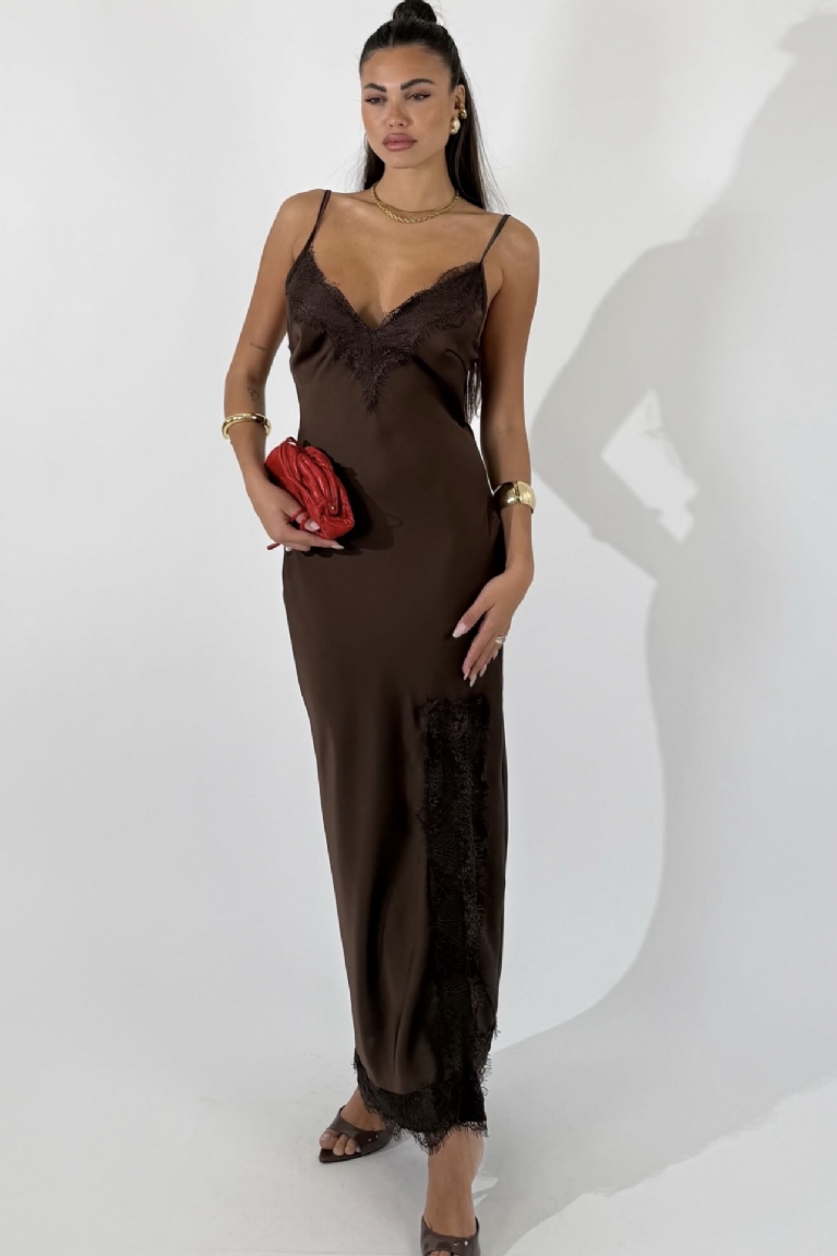 Φόρεμα Μακρύ Τιράντα Με Δαντέλα & Σκίσιμο - Καφέ
