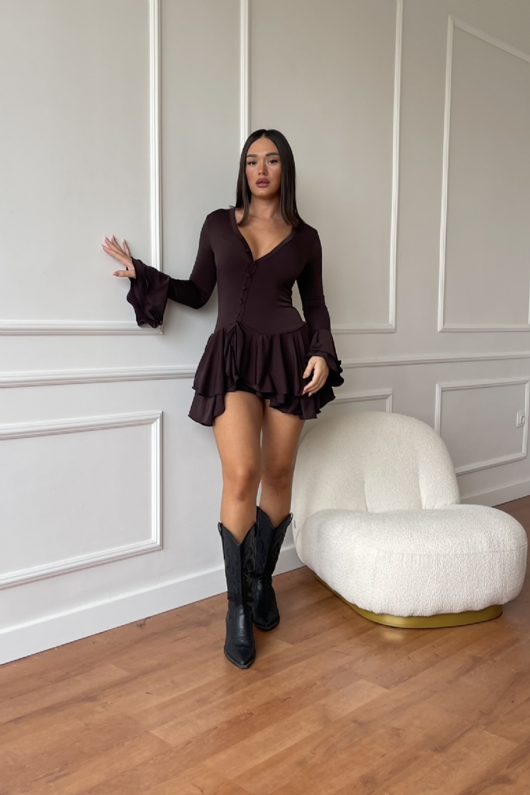 Φόρεμα Μακρυμάνικο Mini Με Βολάν & Κουμπιά - Καφέ
