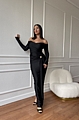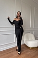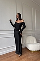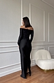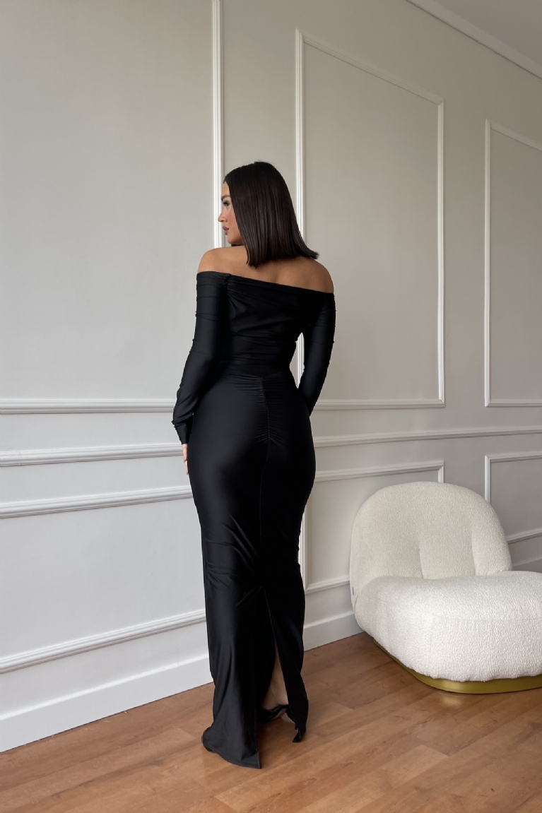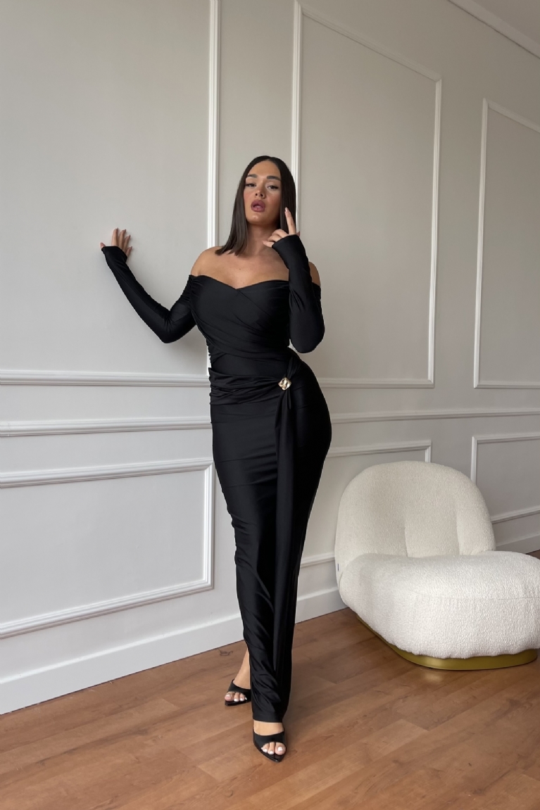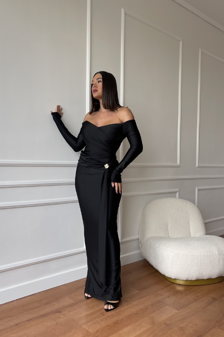 Εντυπωσιάστε σε κάθε επίσημη εμφάνιση με το maxi μακρυμάνικο έξωμο φόρεμα σε μαύρο χρώμα, διακοσμημένο με χρυσή λεπτομέρεια.
