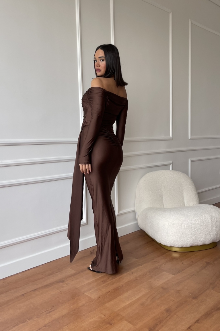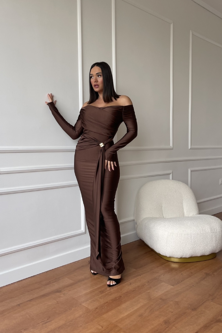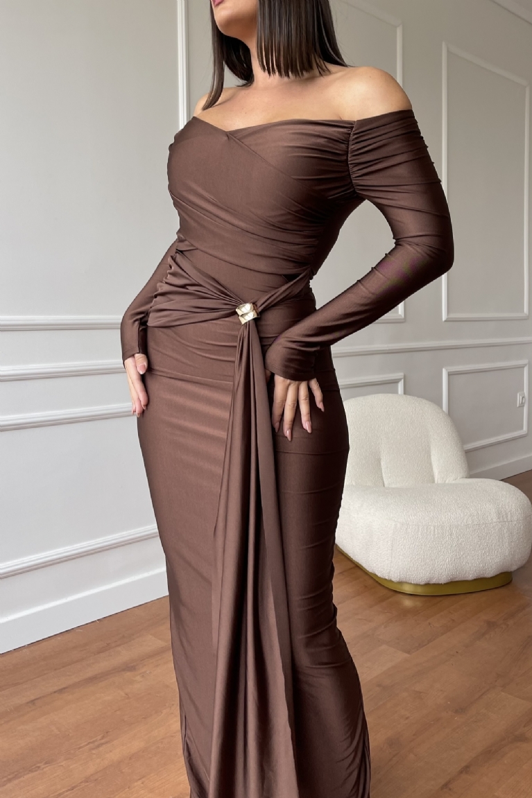 Αναδείξτε το στυλ σας με το maxi μακρυμάνικο φόρεμα σε καφέ απόχρωση και εντυπωσιακή, χρυσή λεπτομέρεια στη μέση.