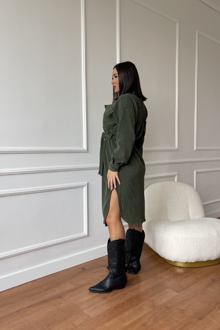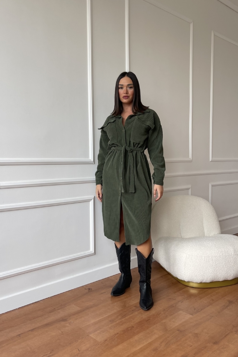 Φόρεμα Κοτλέ Midi Με Κουμπιά & Ζώνη - Χακί