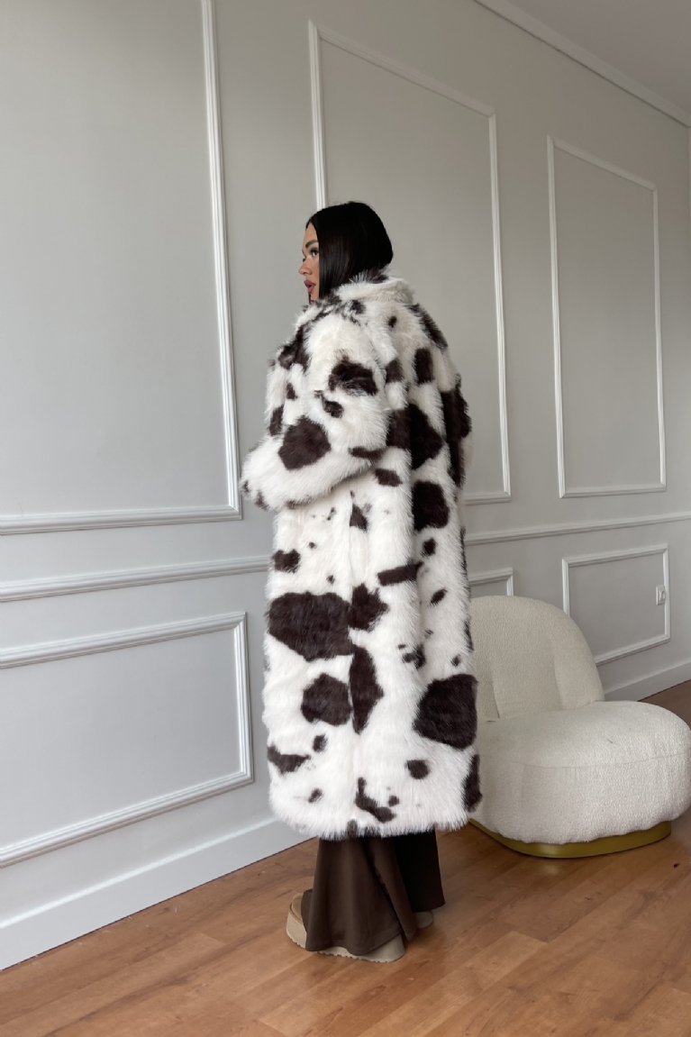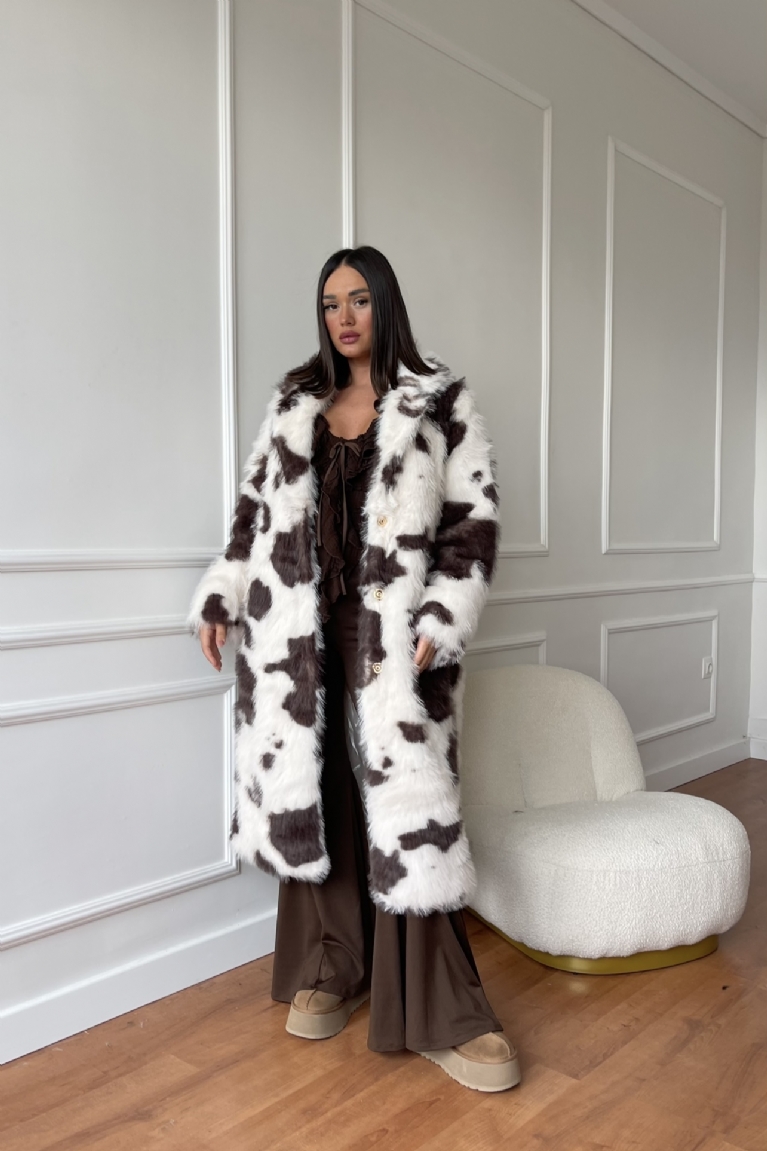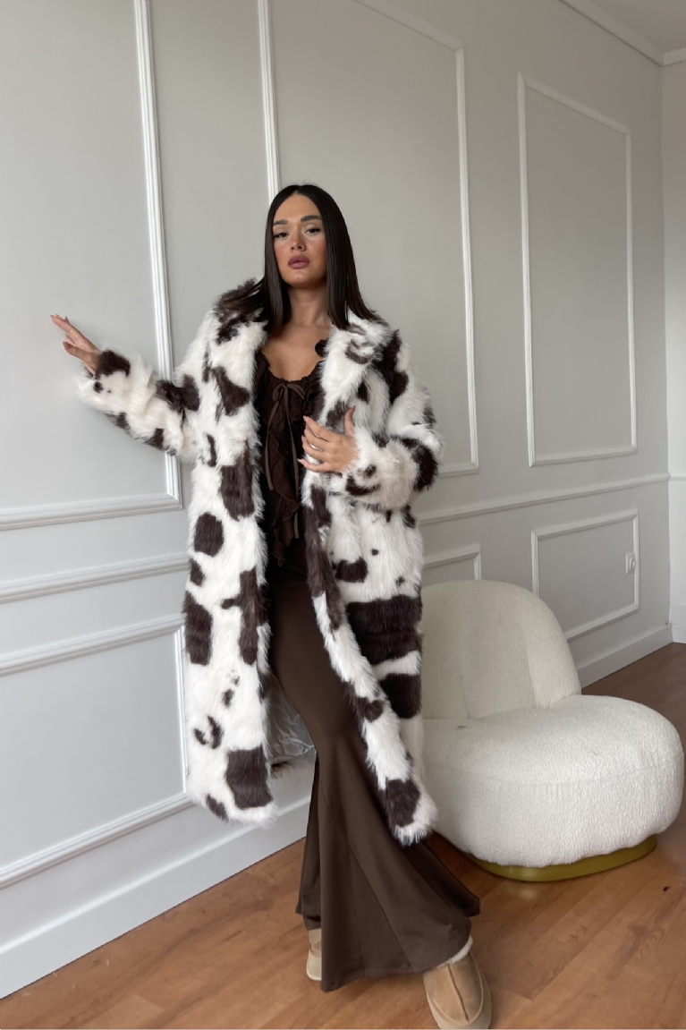 Αναδείξτε το στιλ σας με τη μακρυά γούνα Cow Print σε καφέ αποχρώσεις.
