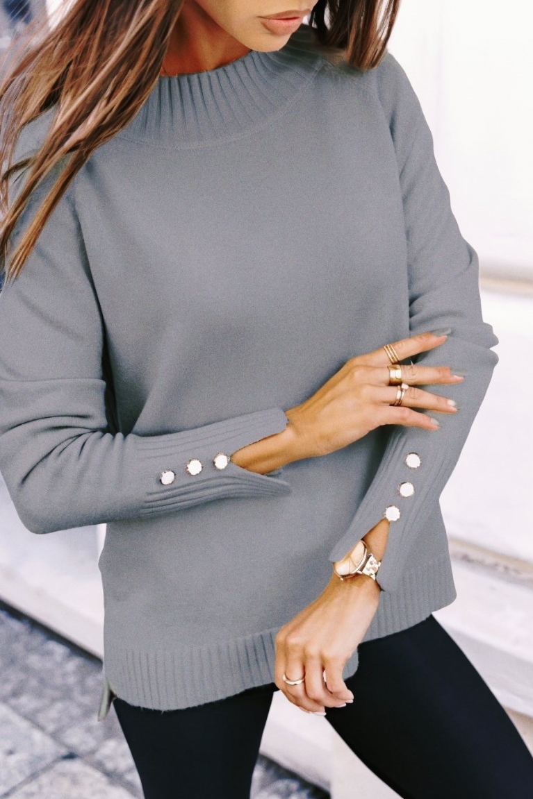 Ανανεώστε το formal look σας με αυτή τη γκρι πλεκτή μπλούζα, που ξεχωρίζει με κομψά κουμπιά στα μανίκια.