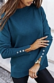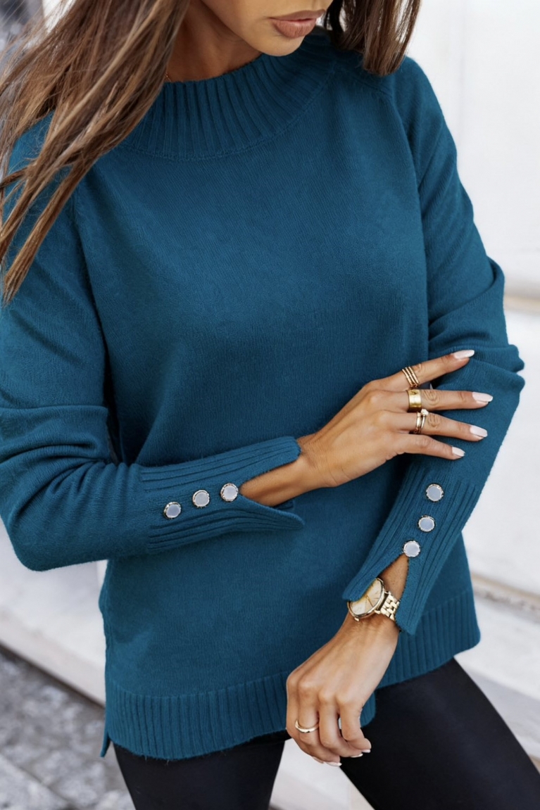 Αναδείξτε το στυλ σας με τη πλεκτή μπλούζα σε κομψό πετρόλ χρώμα και διακοσμητικά κουμπιά στα μανίκια.