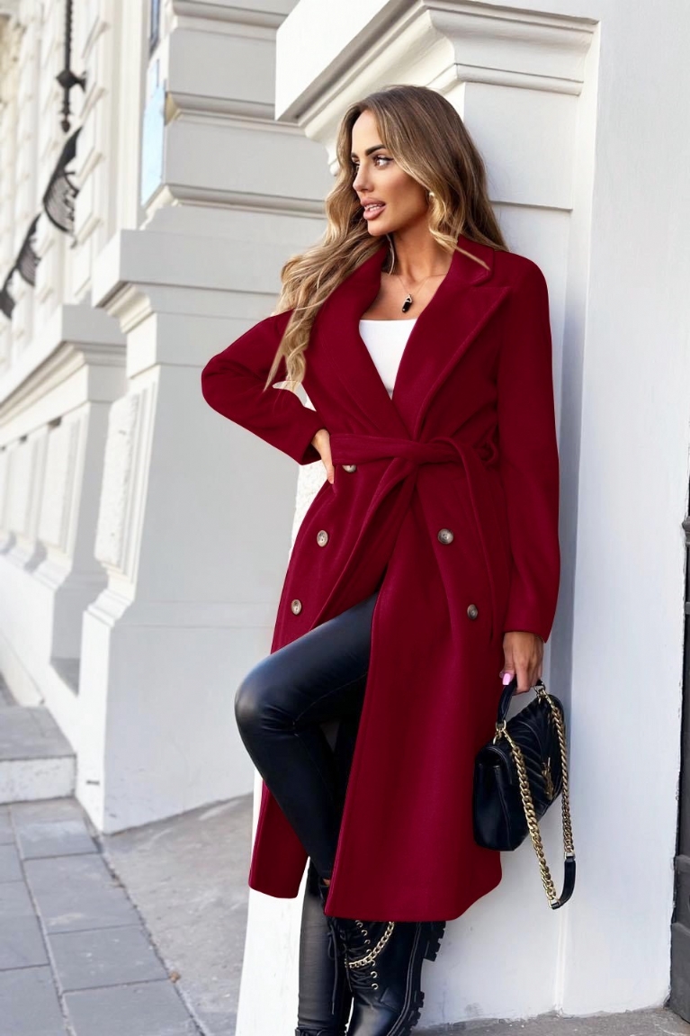 Αναδείξτε τη θηλυκότητα και τη δυναμική σας με το παλτό σε μπορντό απόχρωση, που ξεχωρίζει για τα κομψά κουμπιά και τη ζώνη στη μέση.