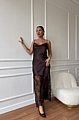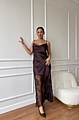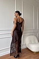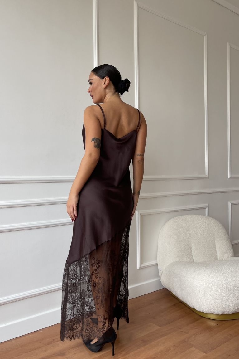 Αναδείξτε τη θηλυκότητά σας με το σατέν ασύμμετρο φόρεμα σε καφέ χρώμα, διακοσμημένο με εντυπωσιακή δαντέλα.