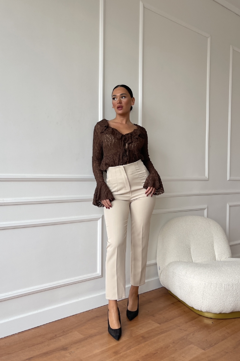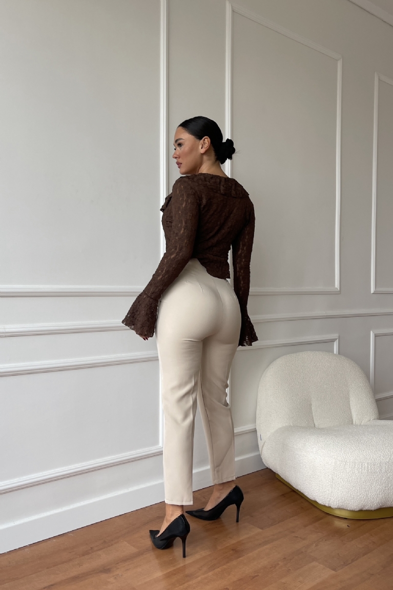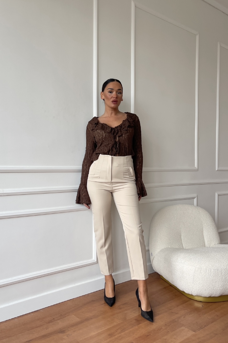 Αναδείξτε το στυλ σας με αυτό το ψηλόμεσο παντελόνι σε ίσια γραμμή και διαχρονικό μπεζ χρώμα.