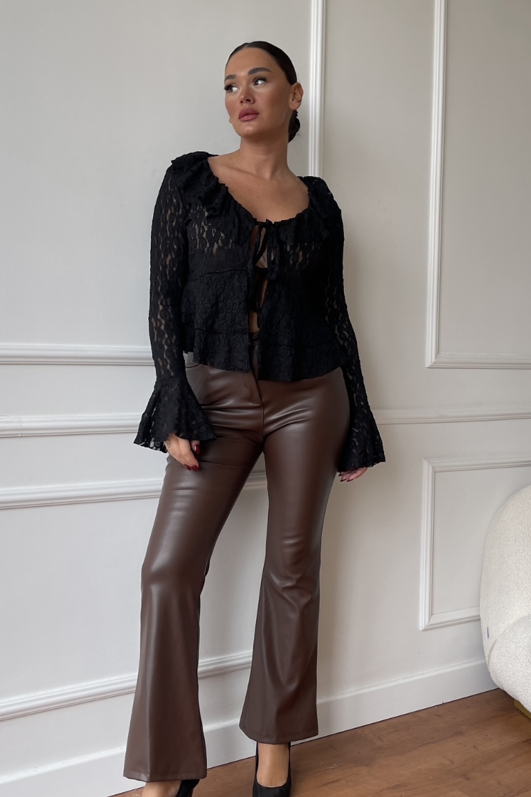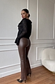 Αναδείξτε το στυλ σας με αυτό το εντυπωσιακό δερμάτινο καμπάνα παντελόνι σε καφέ χρώμα.