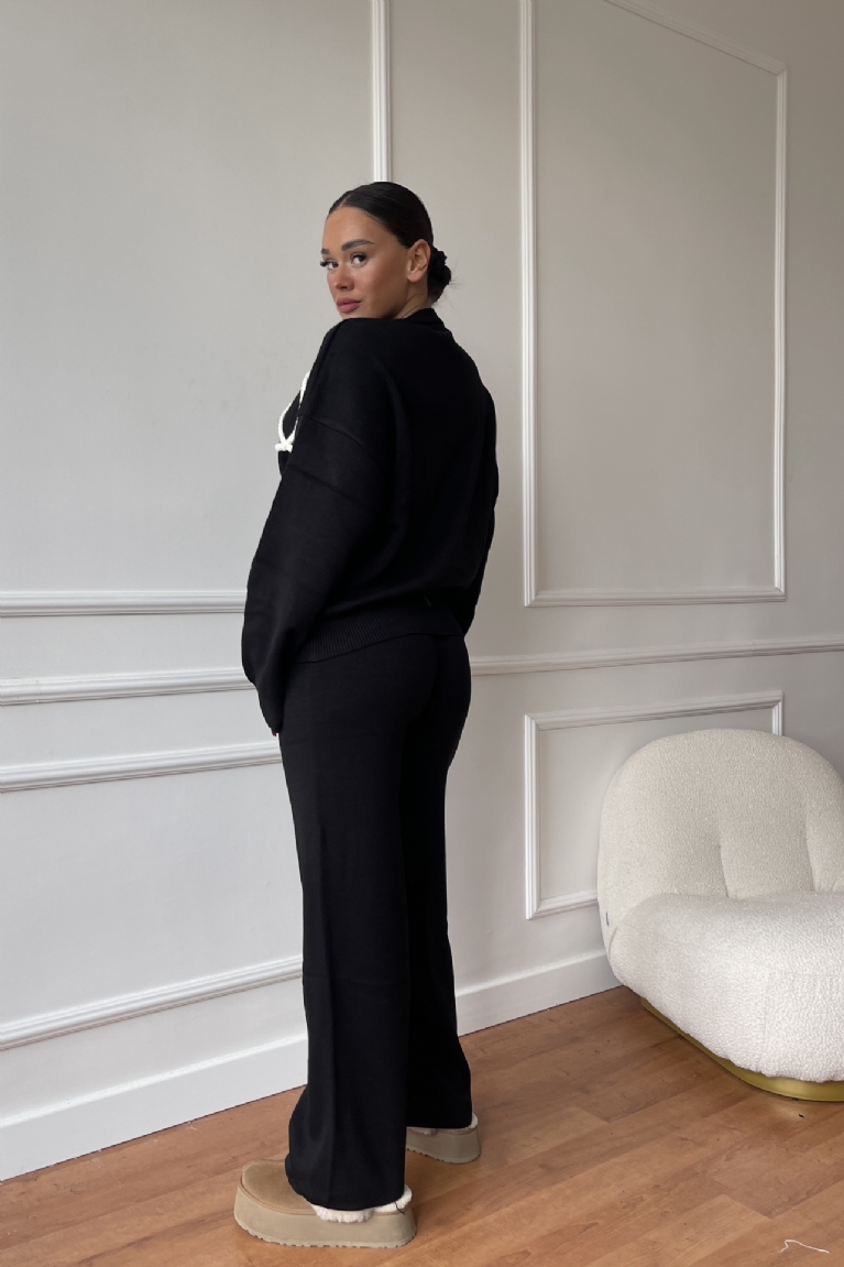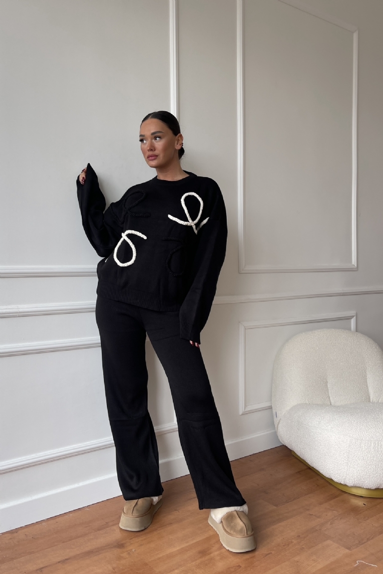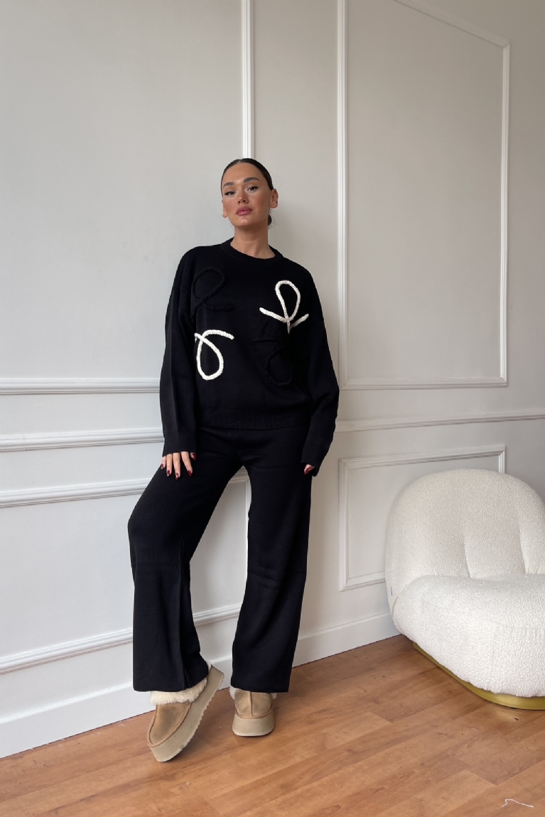 Σετ Μπλούζα Πλεκτή Με Σχέδια & Παντελόνα - Μαύρο