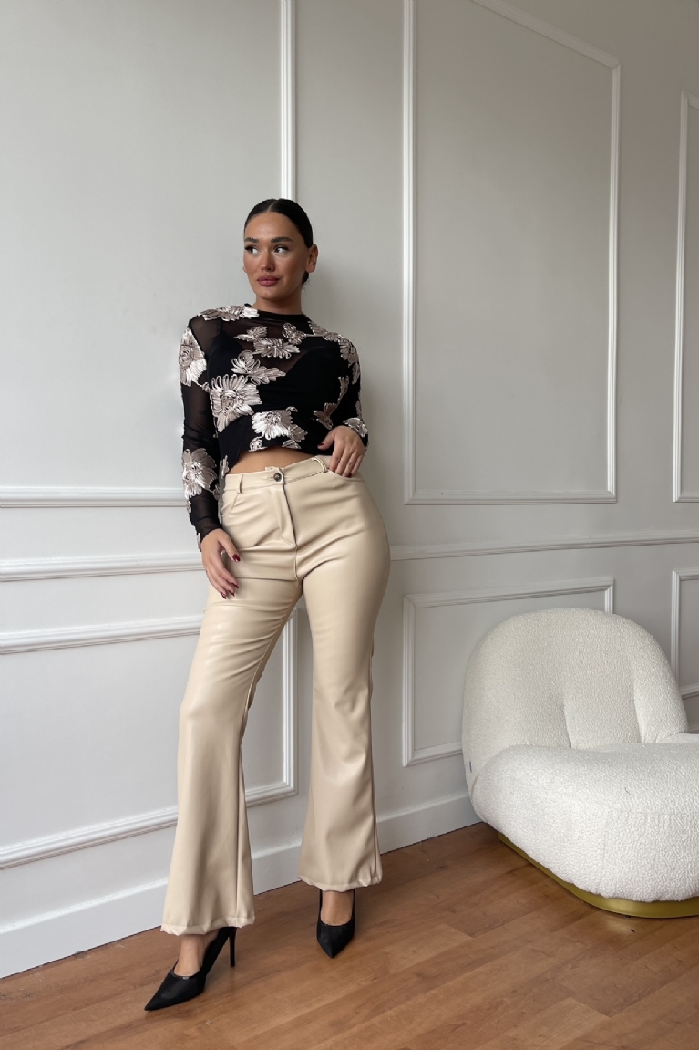 Αναδείξτε το στυλ σας με το μακρυμάνικο top διαφάνεια με λουλούδια σε κομψό μπεζ χρώμα.