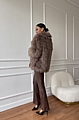 Η γούνα σε καφέ πούρου χρώμα με κοντό μήκος και γιακά προσφέρει μοναδική αίσθηση πολυτέλειας και άνεσης.