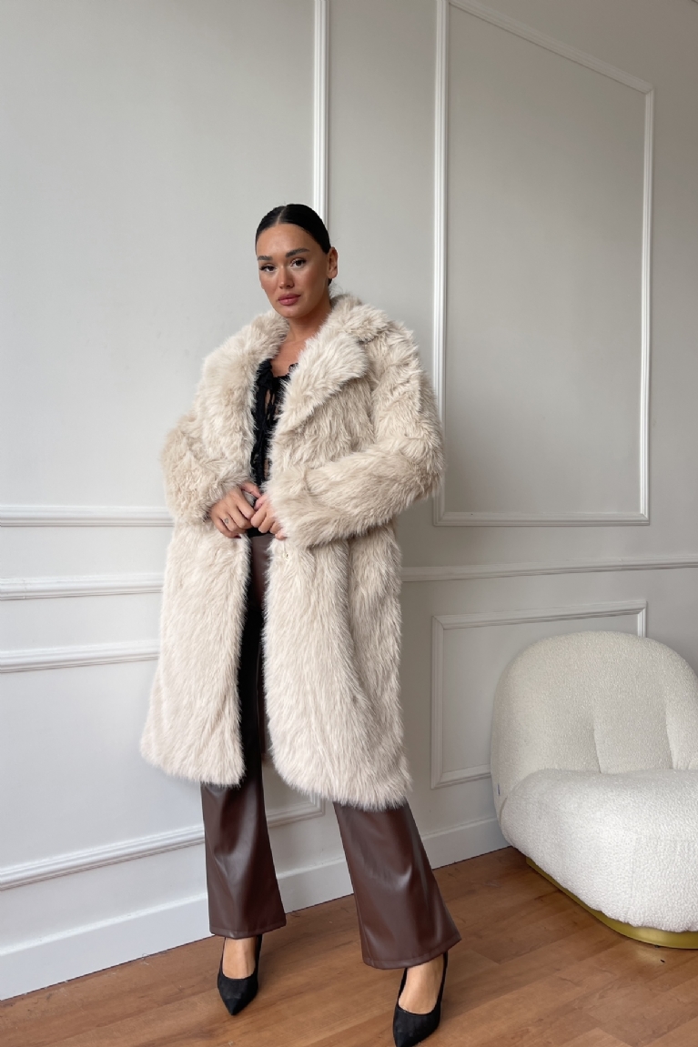 Αναδείξτε το στυλ σας με αυτή τη μακριά γούνα σε μπεζ χρώμα, που χαρίζει κομψότητα και πολυτέλεια σε κάθε σας εμφάνιση.