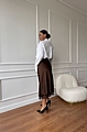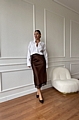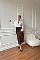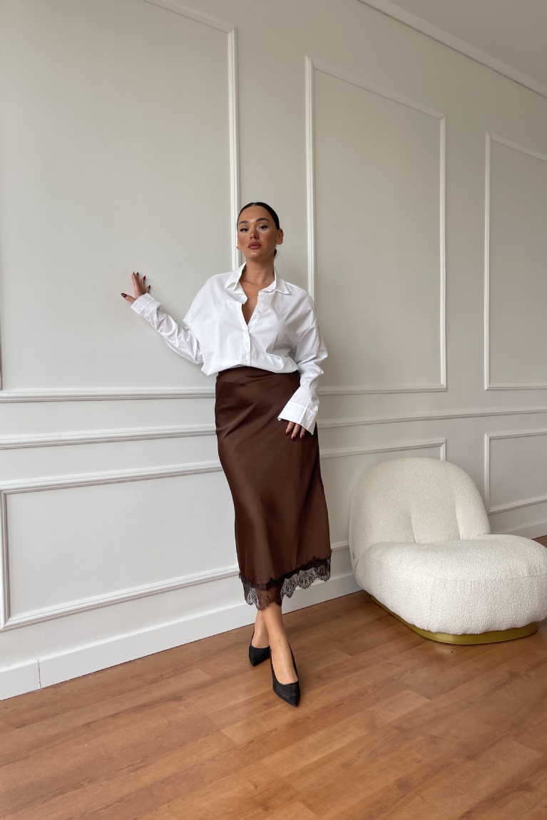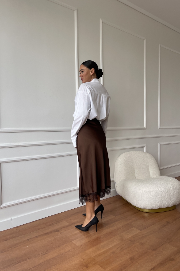 Αναδείξτε τη θηλυκότητά σας με τη σατέν φούστα σε κομψό καφέ χρώμα και εντυπωσιακή δαντελένια λεπτομέρεια στο τελείωμα.