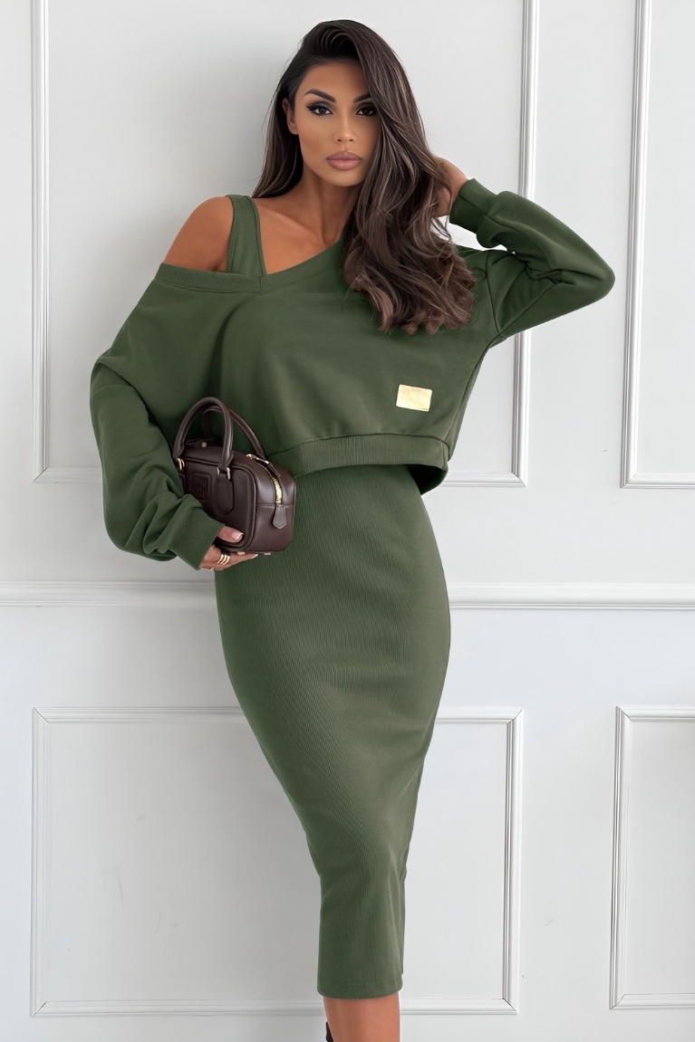 Ανανεώστε το στυλ σας με το κομψό σετ φόρεμα τιράντα midi και μπλούζα φούτερ σε χακί απόχρωση.
