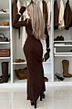 Ξεχωρίστε με το μακρυμάνικο κρουαζέ φόρεμα σε κομψό καφέ χρώμα, με σκίσιμο και βάτες στους ώμους για εντυπωσιακή εμφάνιση.
