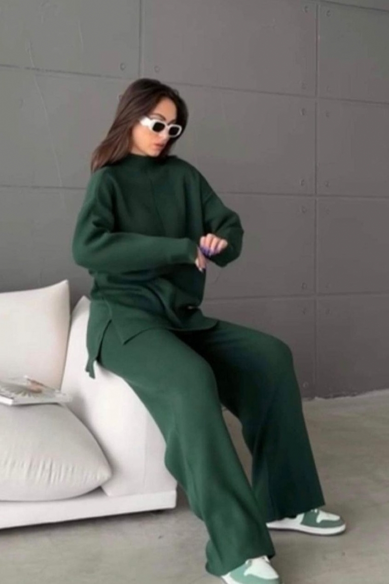 Ανανεώστε το στυλ σας με αυτό το πλεκτό σετ σε κομψό κυπαρισσί χρώμα.