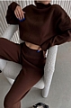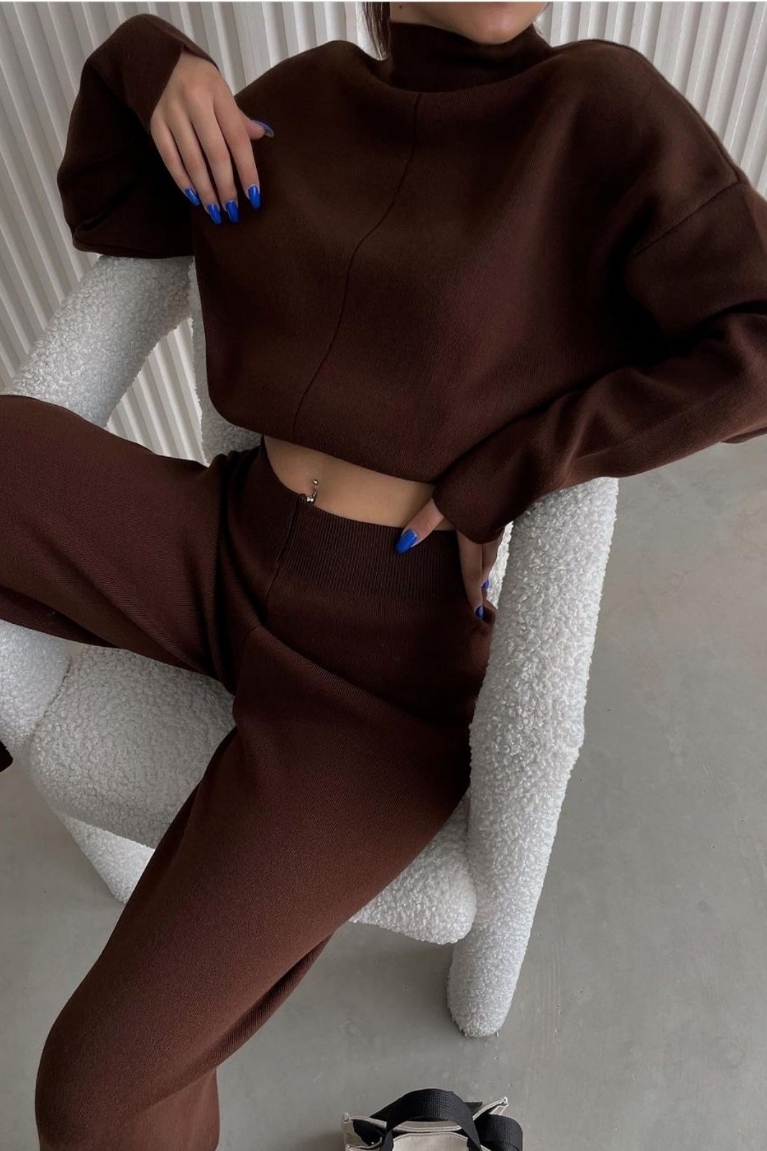 Αναδείξτε το στυλ σας με το πλεκτό σετ σε καφέ απόχρωση, που συνδυάζει παντελόνι και ασύμμετρη μπλούζα για μοναδική κομψότητα.