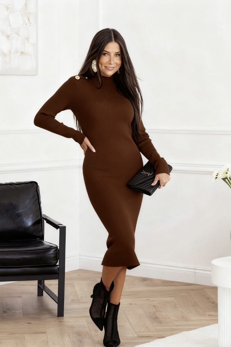 Αναδείξτε το στυλ σας με το μακρυμάνικο midi πλεκτό φόρεμα σε καφέ απόχρωση.