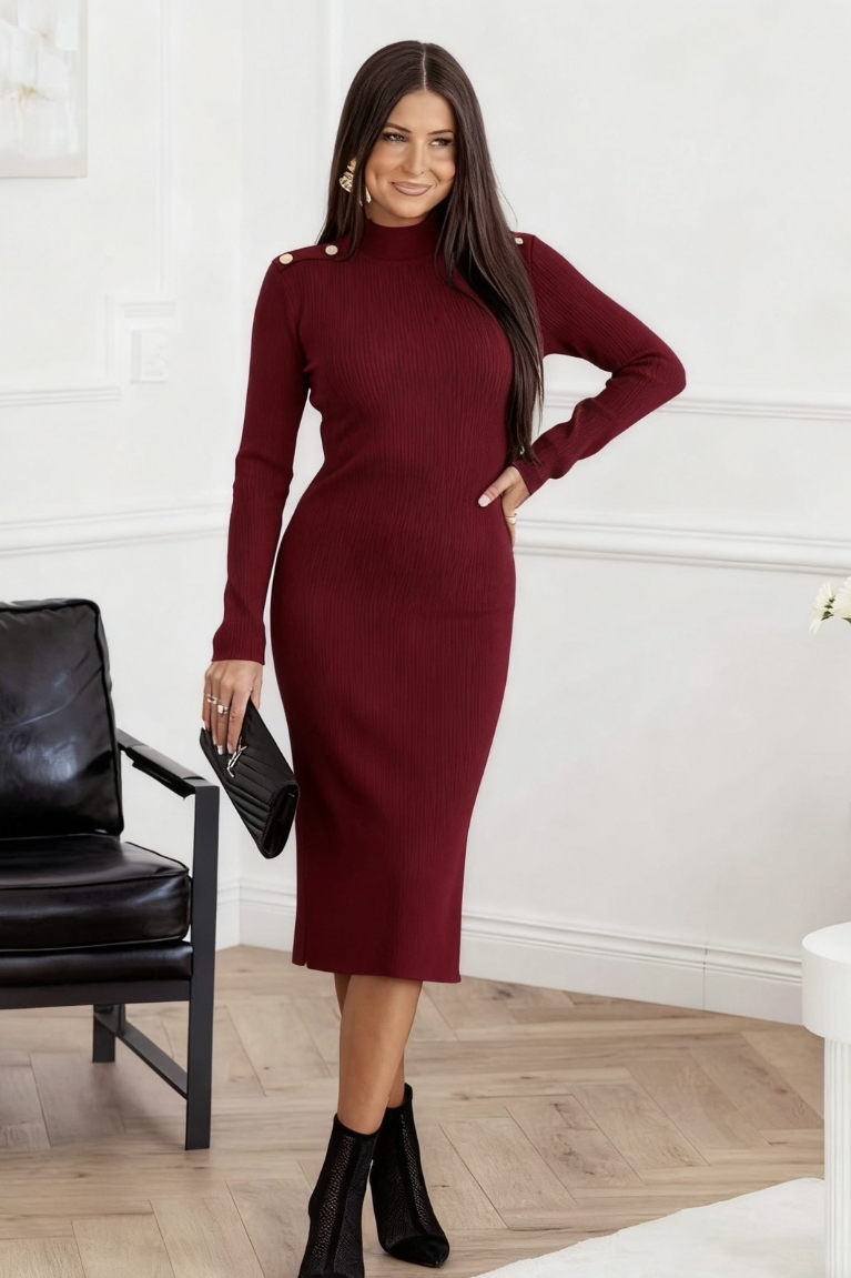 Αναδείξτε το στυλ σας με αυτό το μακρυμάνικο midi πλεκτό φόρεμα σε κομψό μπορντό χρώμα.