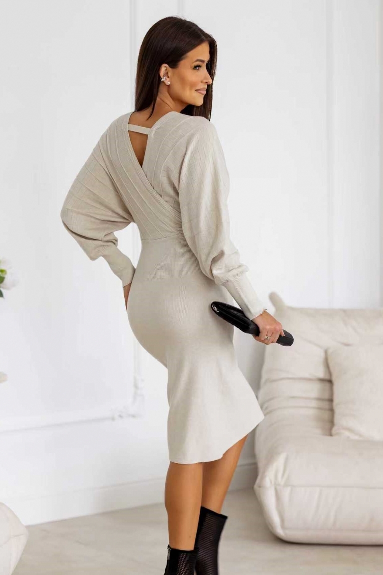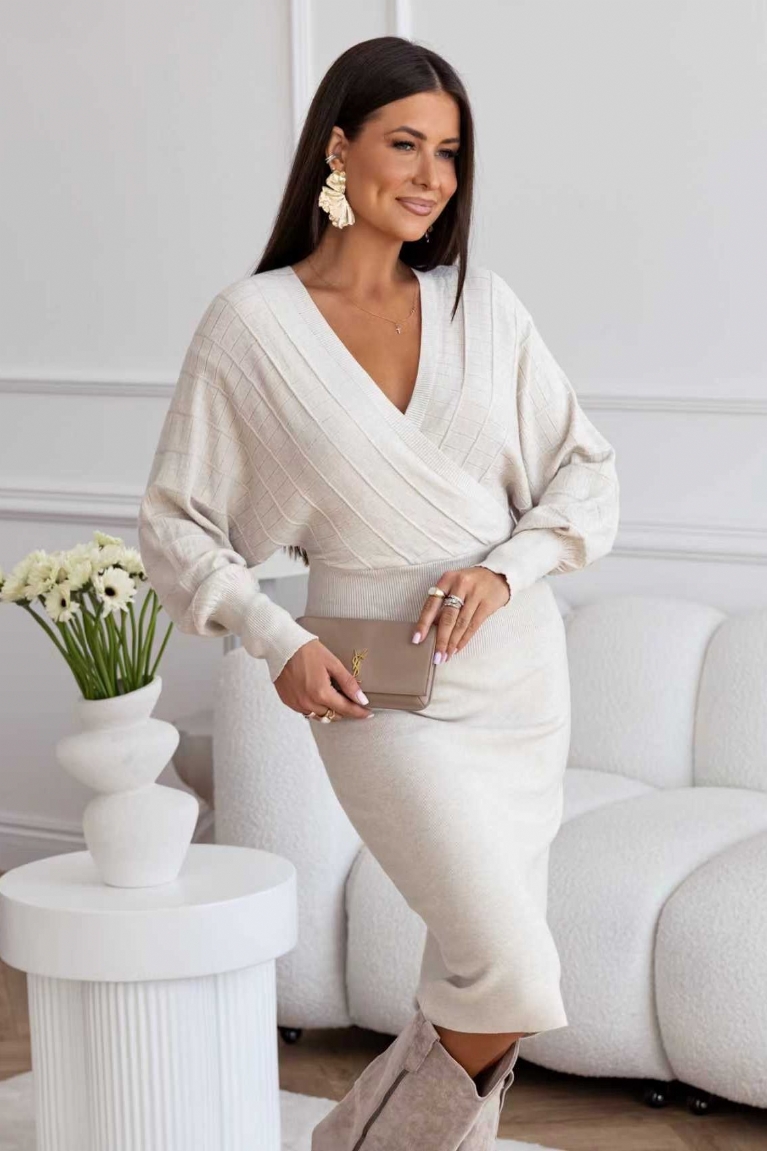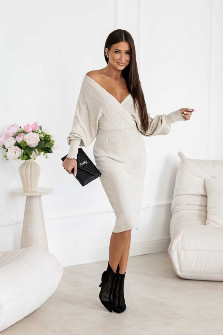 Αναδείξτε το στυλ σας με το midi πλεκτό κρουαζέ φόρεμα σε μπεζ απόχρωση, ιδανικό για κάθε επίσημη περίσταση.
