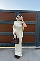 Αναδείξτε το προσωπικό σας στιλ με το μακρύ πλεκτό φόρεμα με έναν ώμο και αποσπώμενο κασκόλ σε διαχρονικό μπεζ χρώμα.