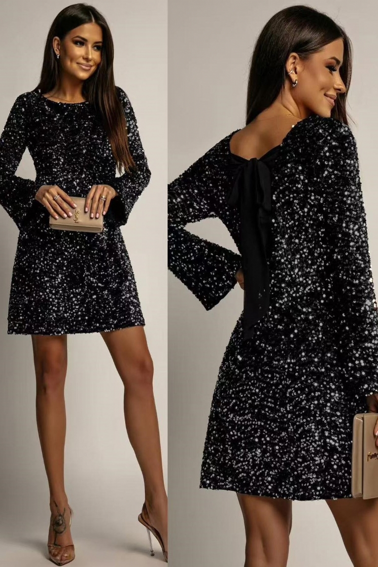 Αναδείξτε τη λάμψη σας με το μακρυμάνικο φόρεμα με παγιέτες σε εντυπωσιακό γκρι χρώμα.