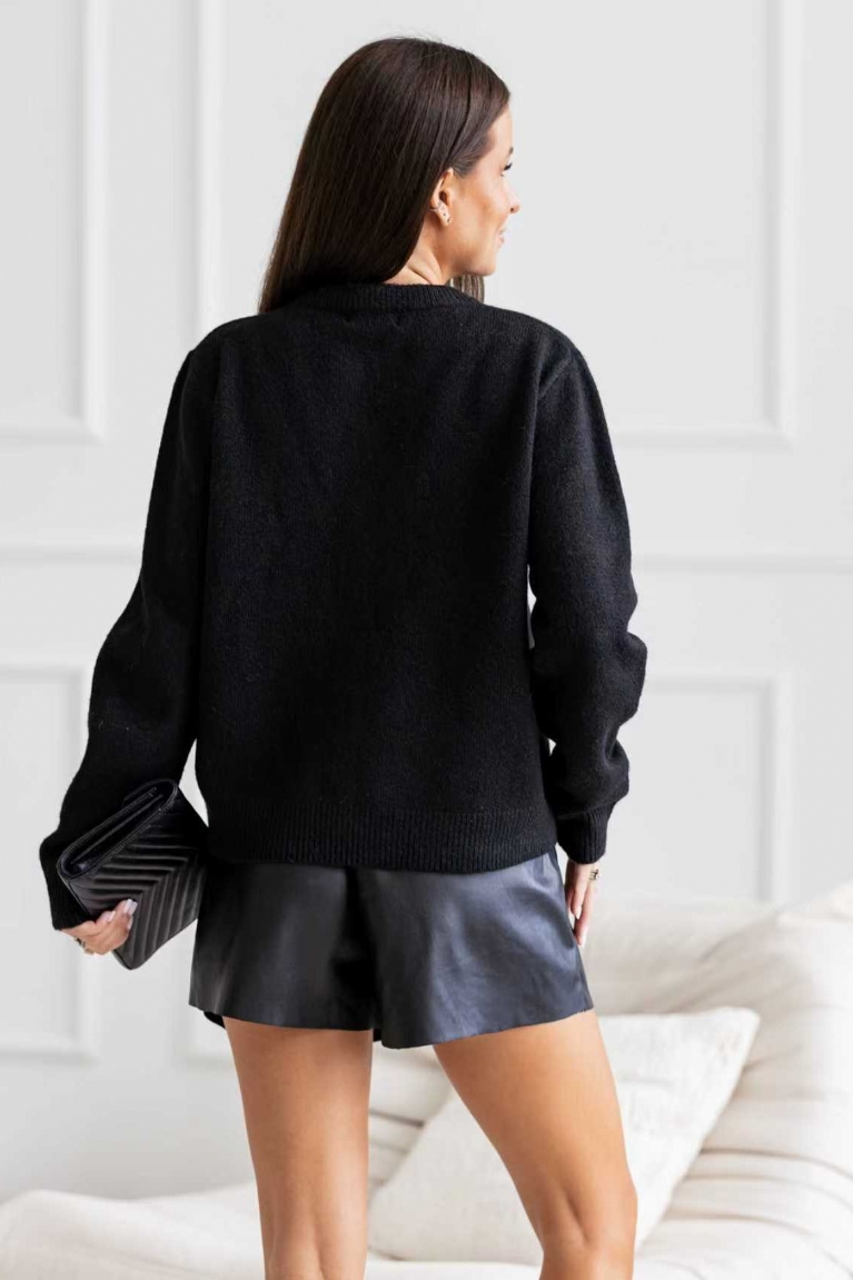 Η μαύρη ζακέτα με κουμπιά και μοναδικό δέσιμο συνδυάζει κομψότητα και διαχρονικό στυλ.