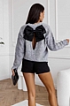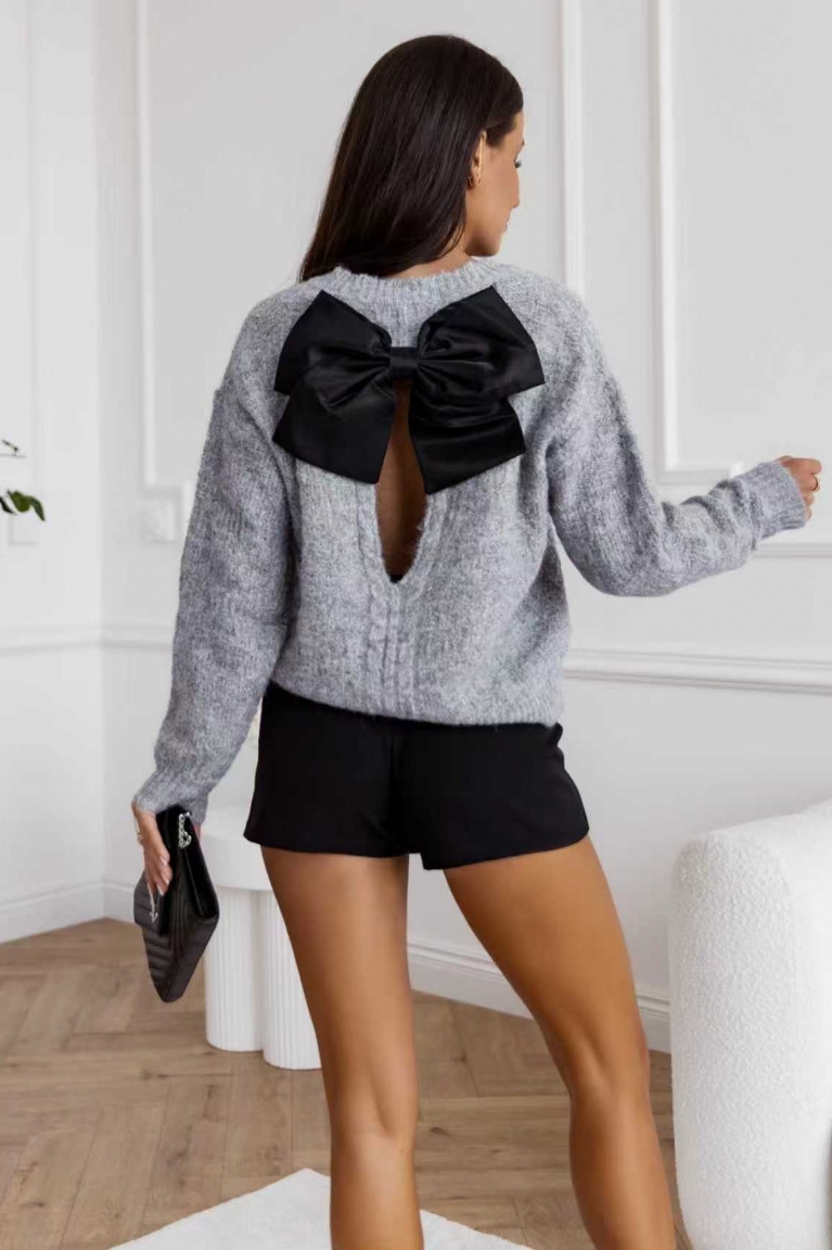Αναδείξτε το στυλ σας με τη γκρι πλεκτή μπλούζα που ξεχωρίζει με τον φιόγκο στην πλάτη.
