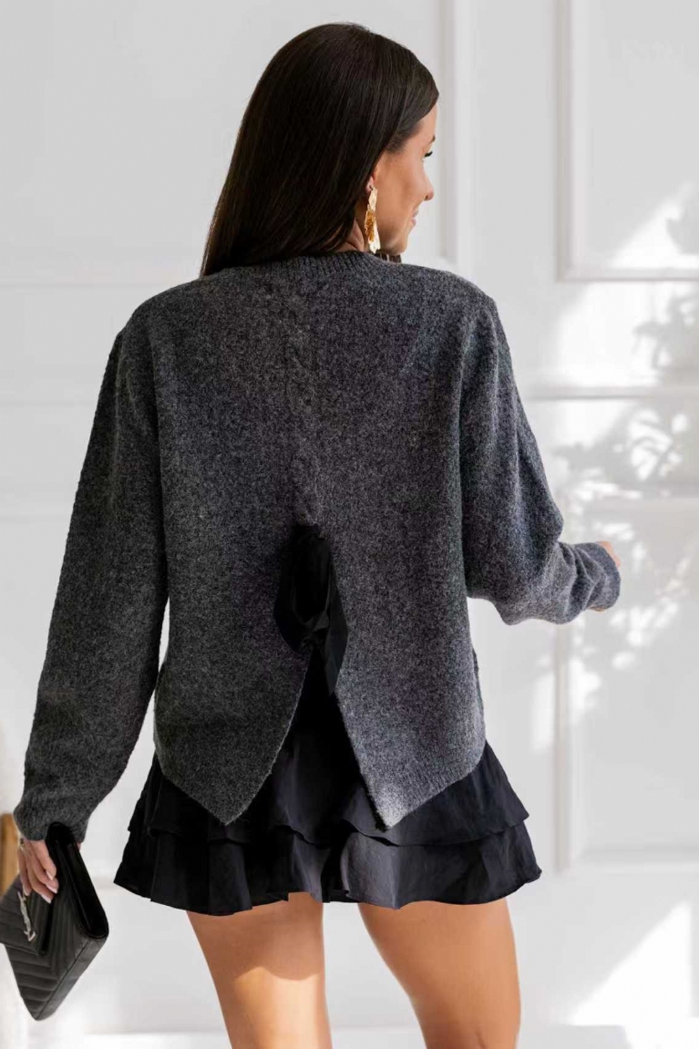 Αναδείξτε το στιλ σας με αυτή τη γκρι πλεκτή μπλούζα, που ξεχωρίζει με το εντυπωσιακό σχέδιο στην πλάτη και τον φιόγκο.