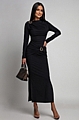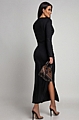 Εντυπωσιάστε με αυτό το μακρυμάνικο μαύρο φόρεμα με χρυσές λεπτομέρειες και διακριτικό άνοιγμα.