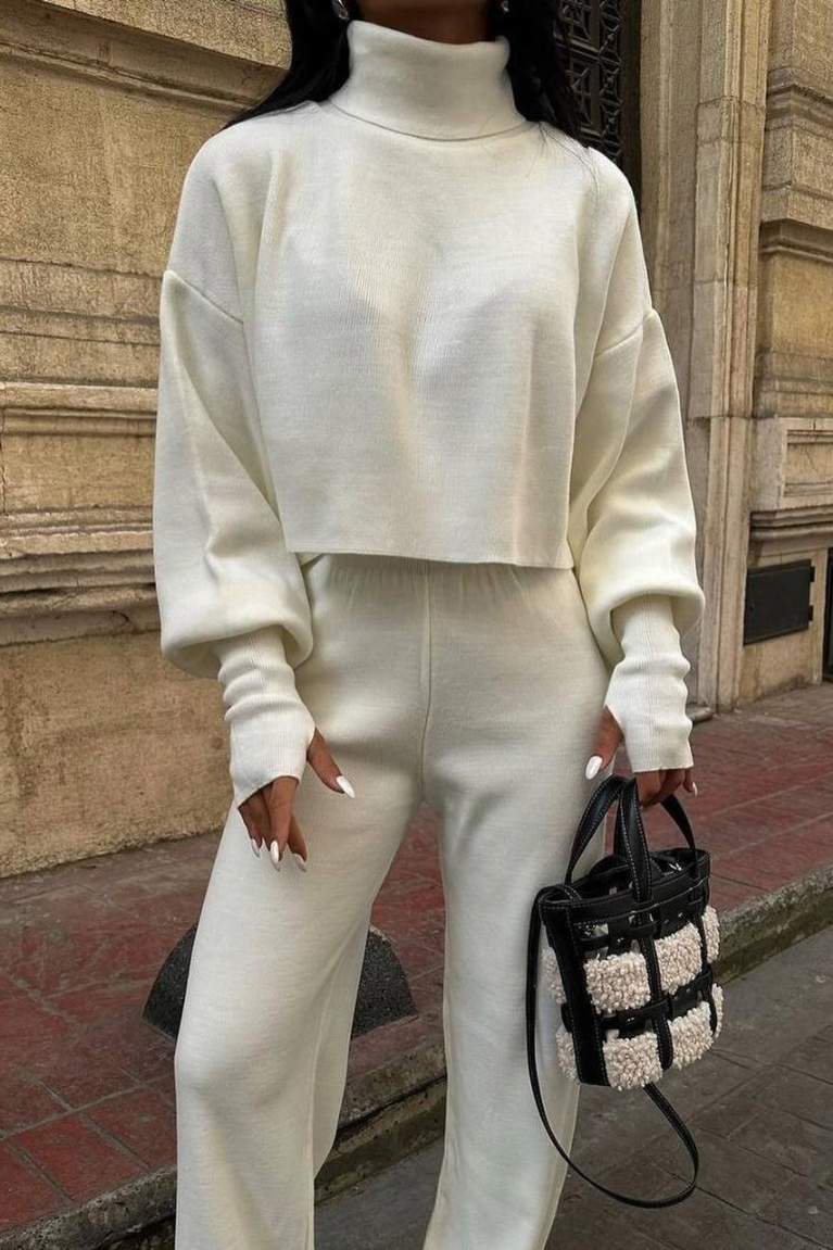 Αναδείξτε το στυλ σας με αυτό το κομψό σετ πλεκτής μπλούζας ζιβάγκο και παντελονιού σε λευκό χρώμα.