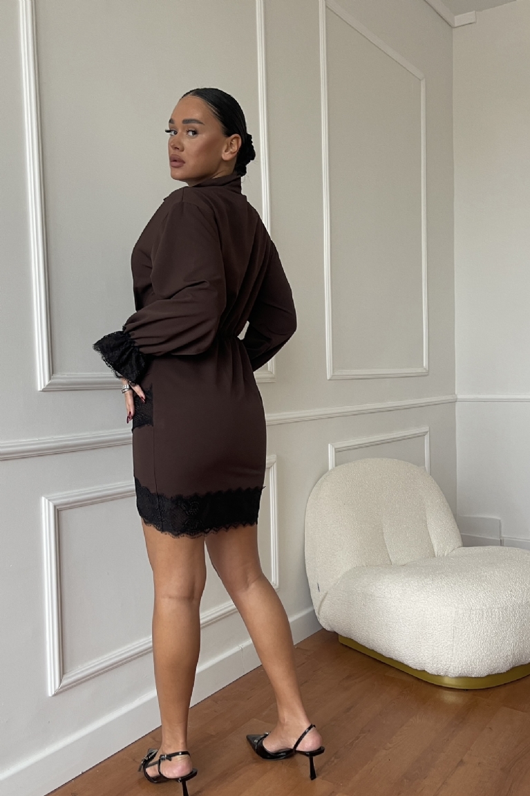 Αναδείξτε τη θηλυκότητά σας με το mini κρουαζέ φόρεμα σε κομψό καφέ χρώμα και εντυπωσιακή δαντέλα στο τελείωμα.
