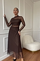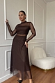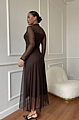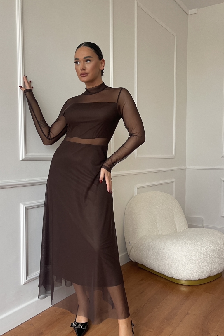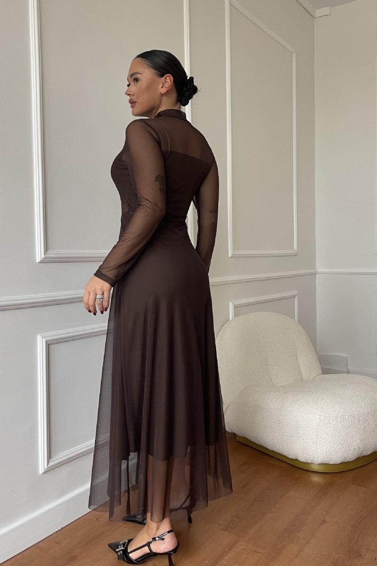 Αναδείξτε το στυλ σας με το μακρύ φόρεμα σε καφέ χρώμα, σχεδιασμένο με διαφάνειες που χαρίζουν μοναδική κομψότητα.