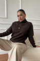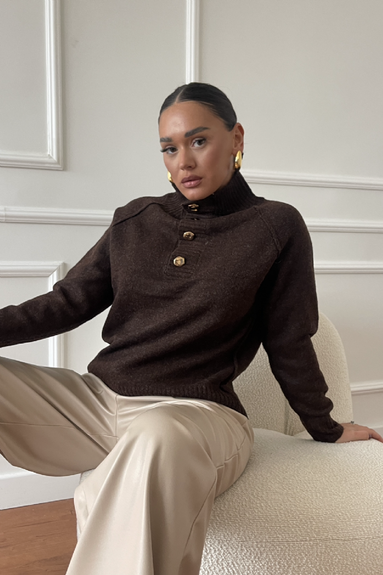 Αναδείξτε το στυλ σας με αυτή την καφέ πλεκτή ζιβάγκο μπλούζα με κομψά χρυσά κουμπιά.