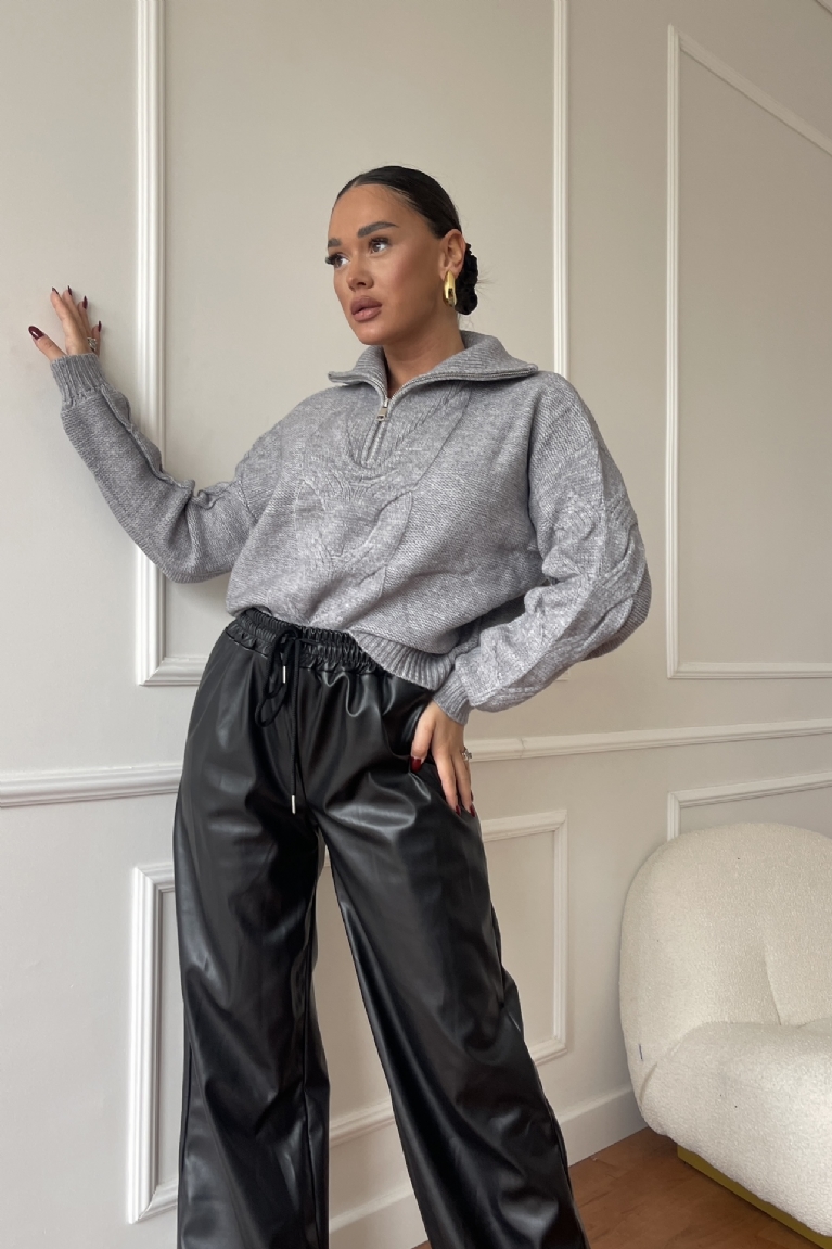 Αναβάθμισε το στυλ σου με τη γκρι πλεκτή ζιβάγκο μπλούζα με φερμουάρ, ιδανική για κομψές formal εμφανίσεις.