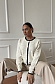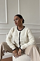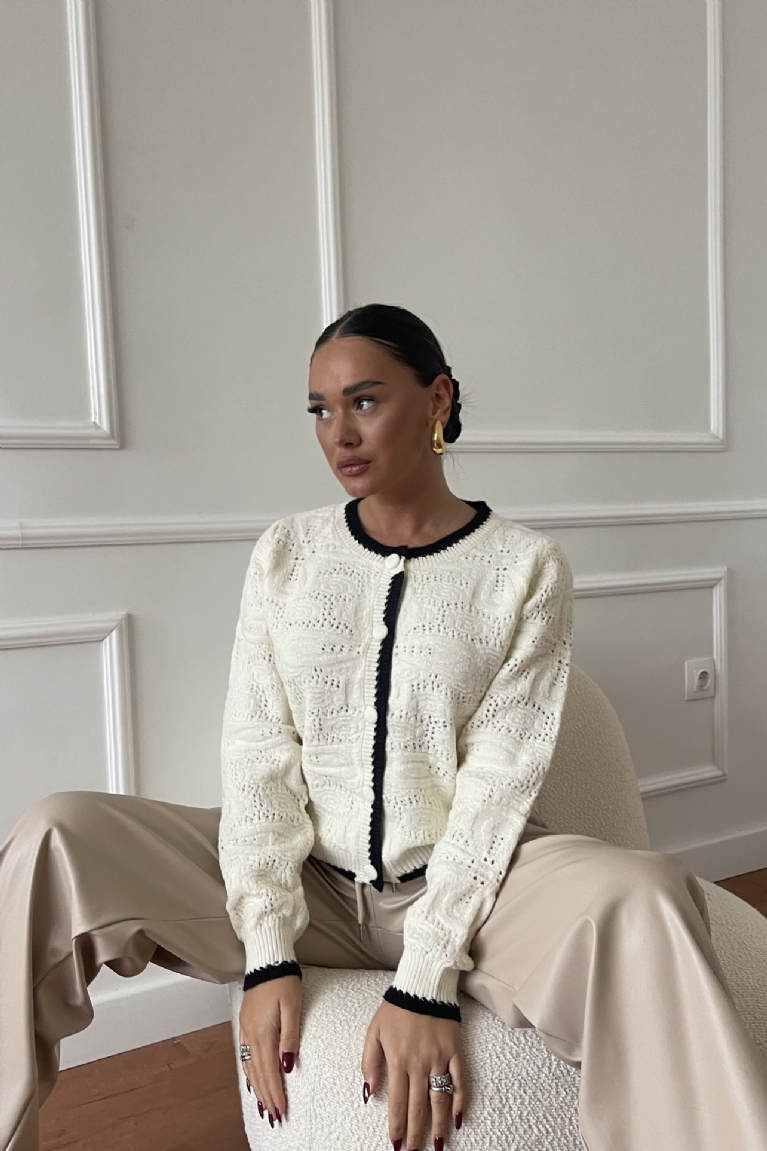 Η πλεκτή ζακέτα με κουμπιά και διχρωμία σε λευκό χρώμα προσφέρει διαχρονική κομψότητα με σύγχρονη αισθητική.