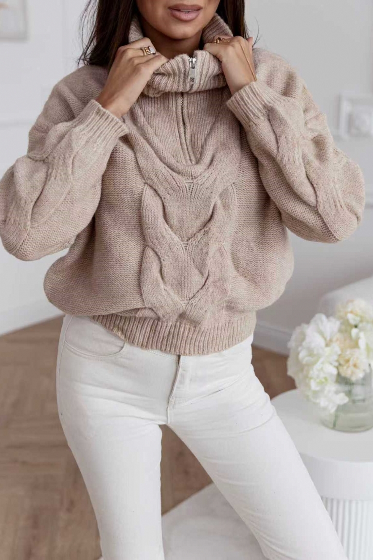 Ανανεώστε το στυλ σας με αυτή τη μοναδική πλεκτή ζιβάγκο μπλούζα με φερμουάρ σε κομψό μπεζ χρώμα.