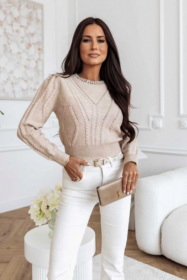 Αναβάθμισε το στυλ σου με αυτή την πλεκτή crop μπλούζα σε μπεζ απόχρωση, διακοσμημένη με ασημένιες λεπτομέρειες.