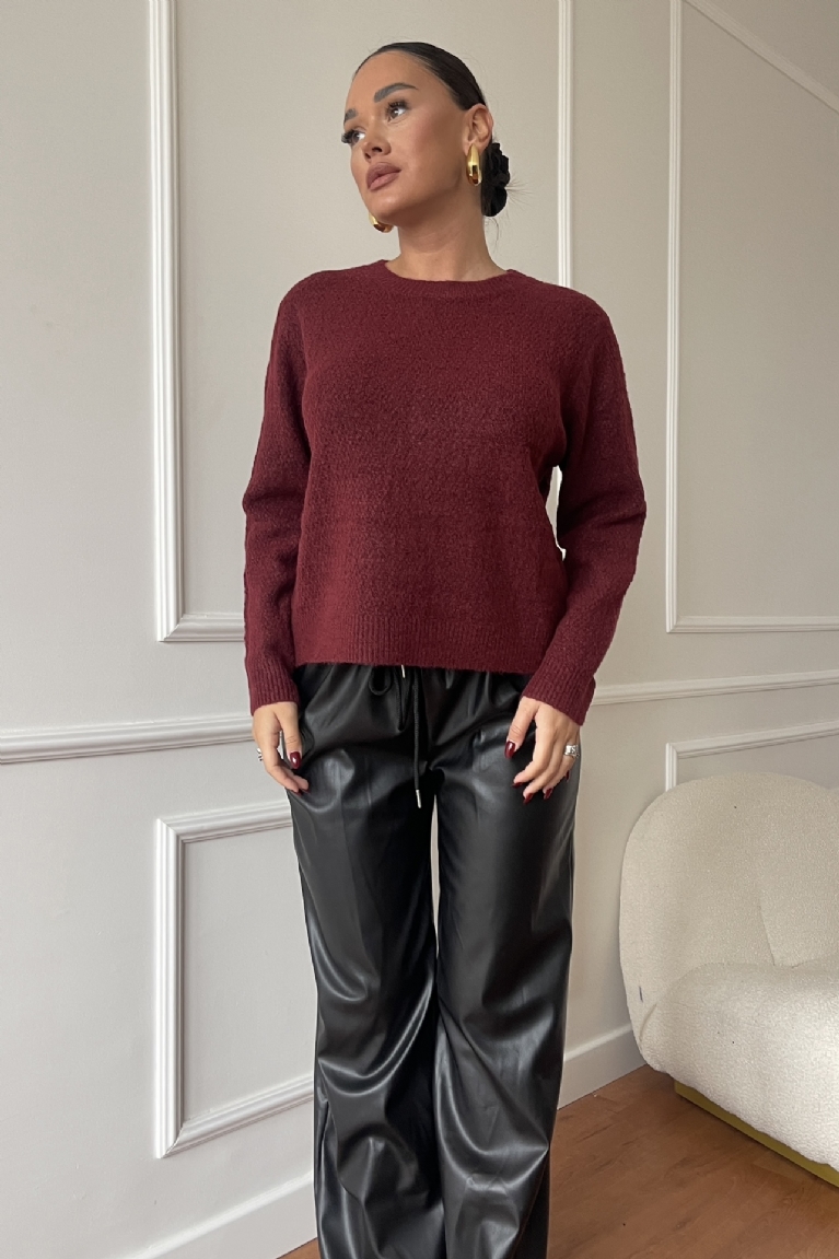 Αναδείξτε το στυλ σας με τη μπορντό πλεκτή μπλούζα που ξεχωρίζει με το ιδιαίτερο σχέδιο στην πλάτη και τον εντυπωσιακό φιόγκο.