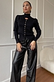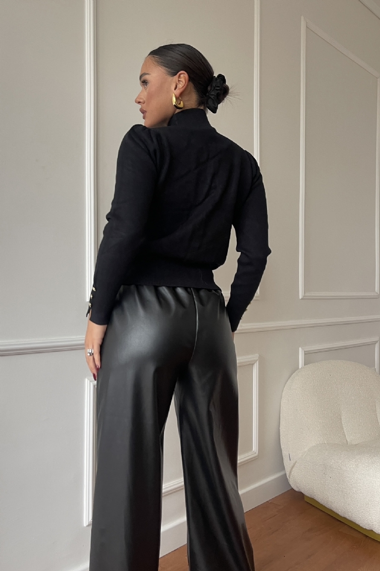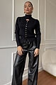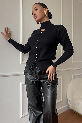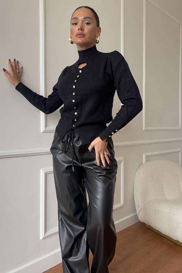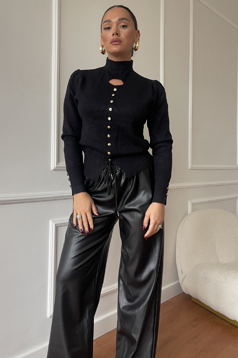 Αναδείξτε το στυλ σας με την πλεκτή ζιβάγκο μπλούζα με εντυπωσιακό άνοιγμα και διακοσμητικά κουμπιά σε καφέ χρώμα.