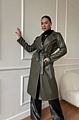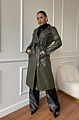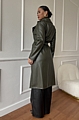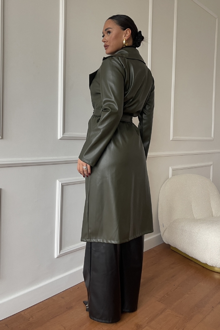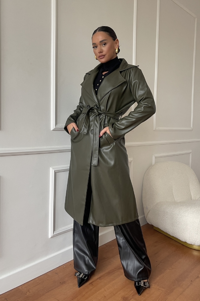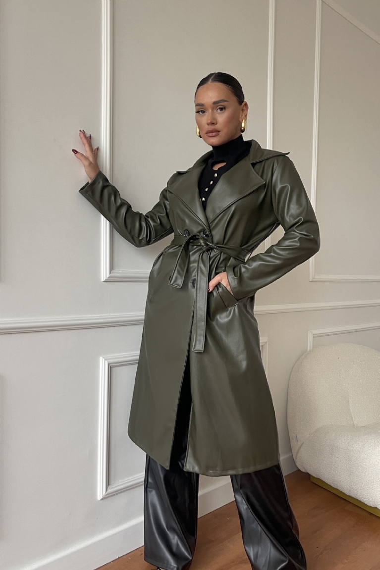 Αναδείξτε το στυλ σας με τη δερμάτινη καμπαρντίνα σε μοντέρνα χακί απόχρωση και κομψή γραμμή.