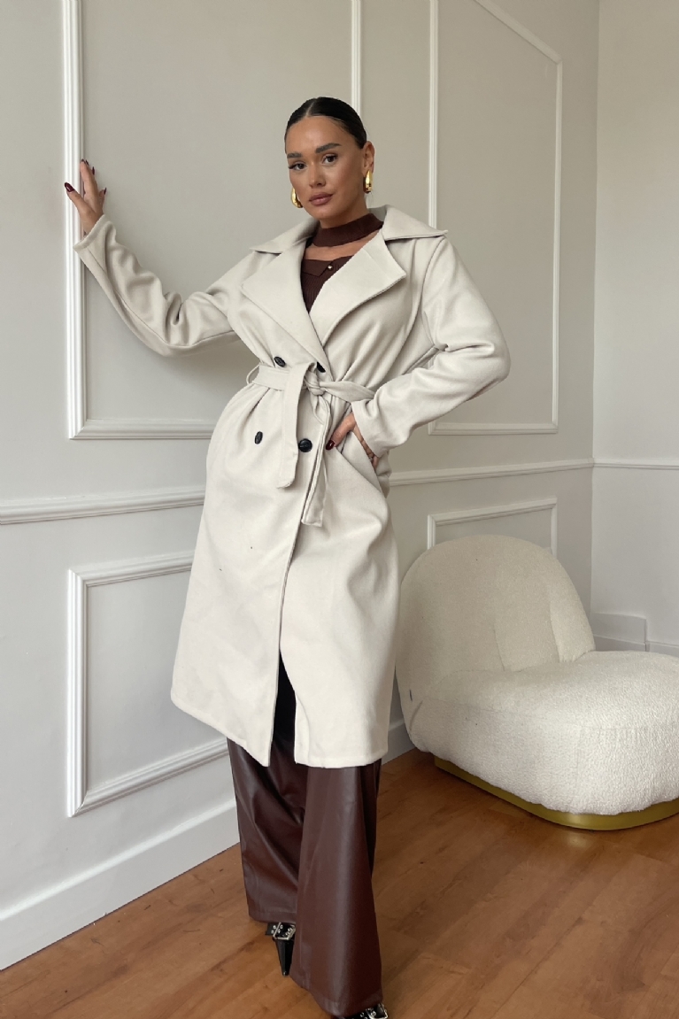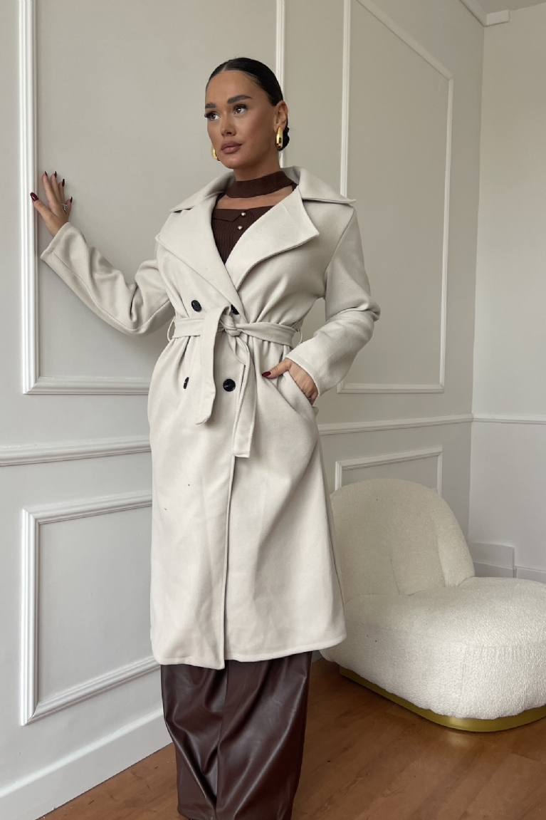 Αναδείξτε το στυλ σας με αυτό το κομψό σουέτ παλτό σε μπεζ απόχρωση, που δένει στη μέση με ζώνη για ιδανική εφαρμογή.