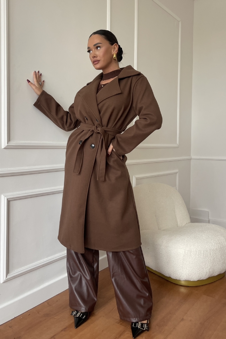Αναδείξτε το στυλ σας με αυτό το κομψό καφέ παλτό σουέτ με κουμπιά και ζώνη στη μέση.