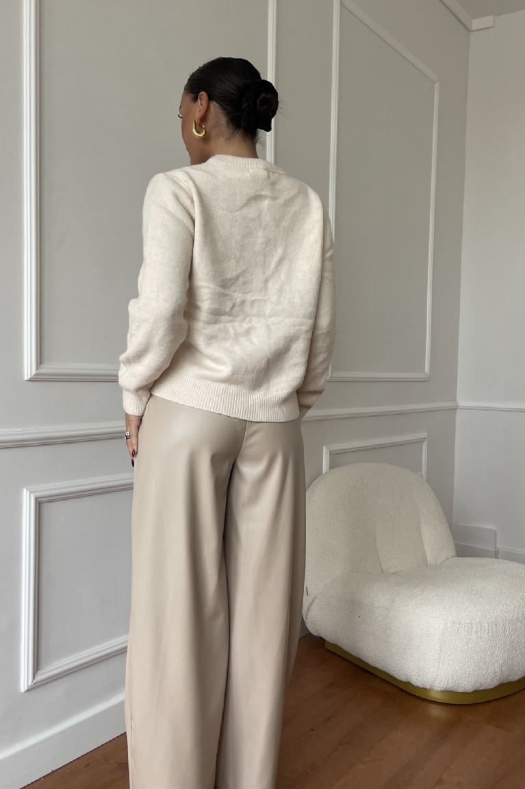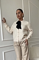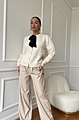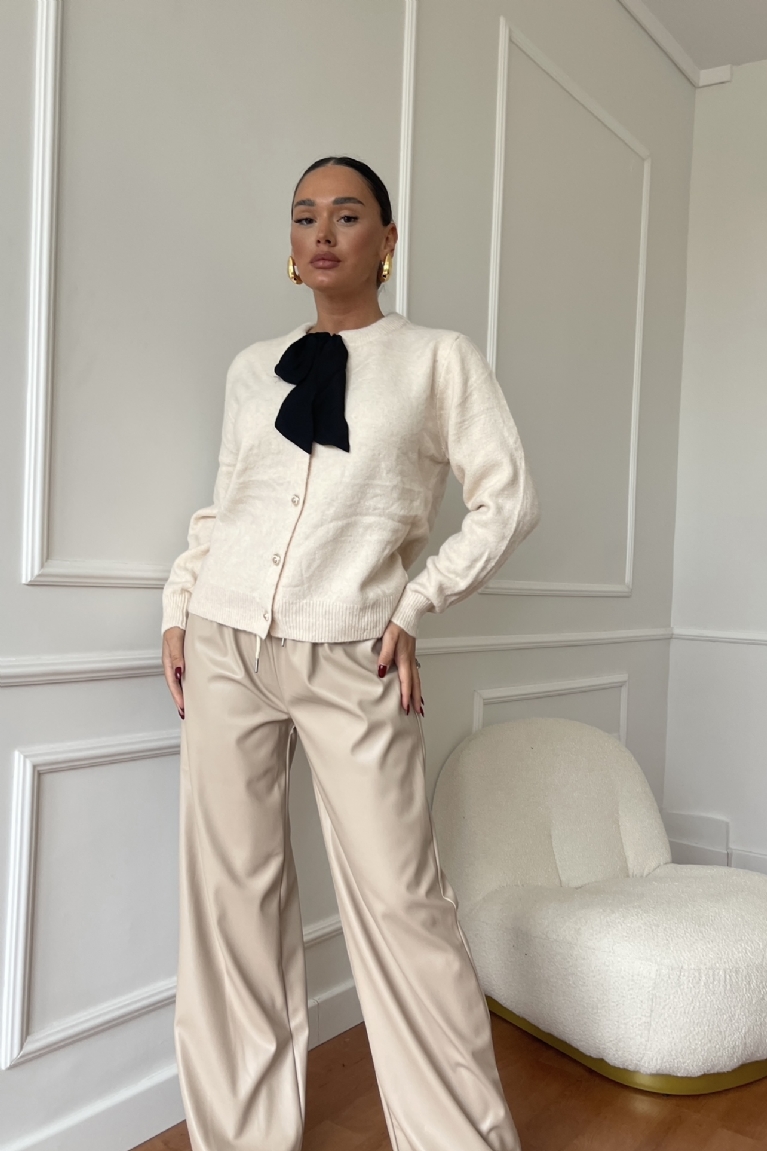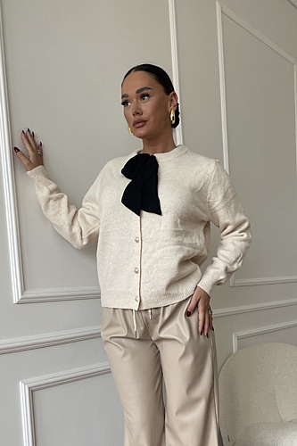 Αναδείξτε τη φινέτσα σας με αυτή τη μπεζ ζακέτα με κουμπιά και κομψό δέσιμο στο λαιμό.