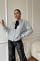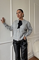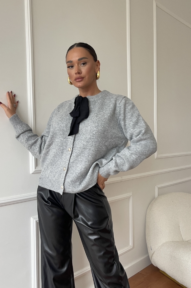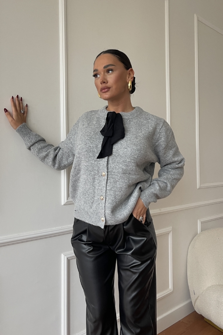 Αναδείξτε το formal στυλ σας με αυτή τη γκρι ζακέτα με κουμπιά και εντυπωσιακό δέσιμο στο λαιμό.