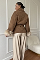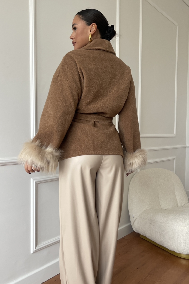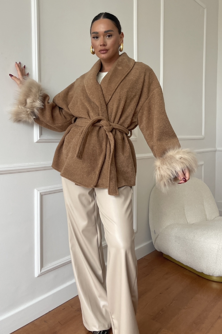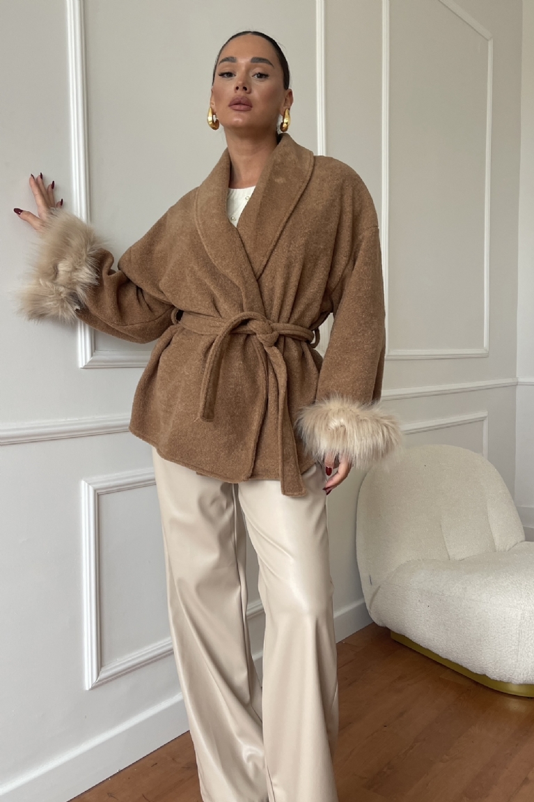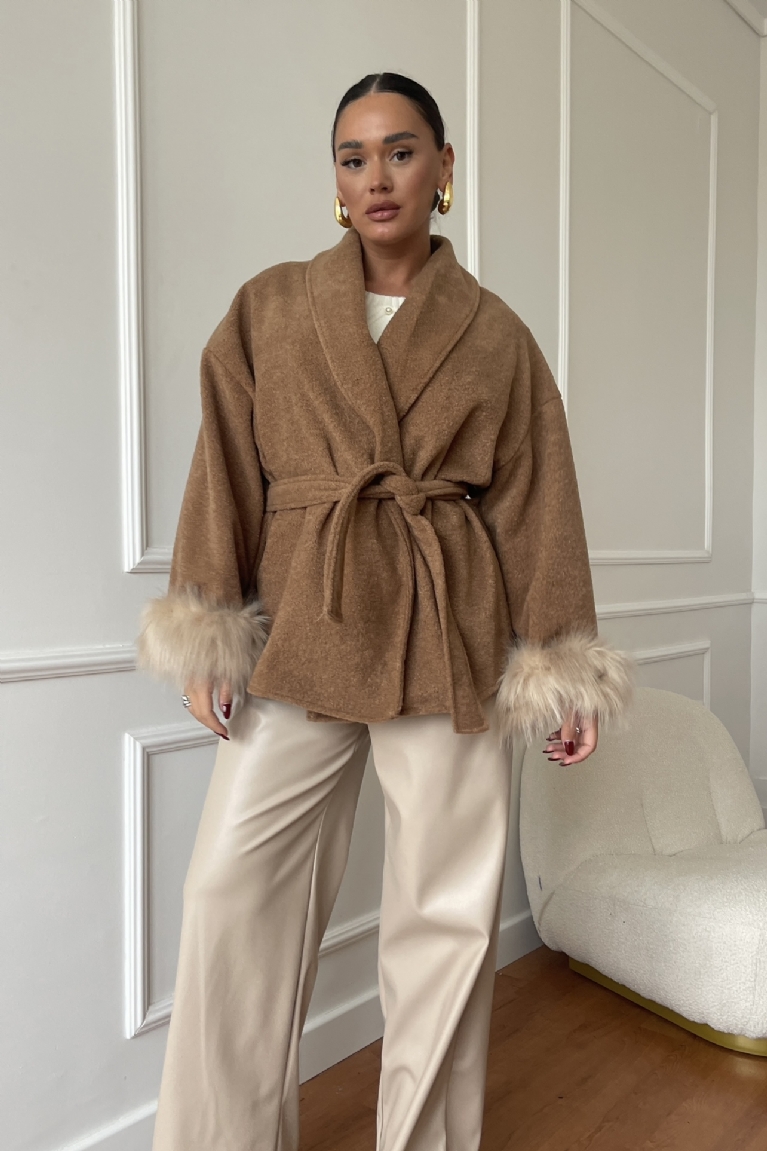 Παλτό Κοντό Σουέτ Με Ζώνη & Λεπτομέρεια Στα Μανίκια - Κάμελ