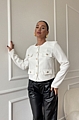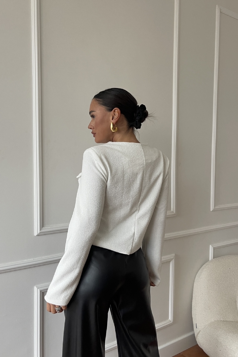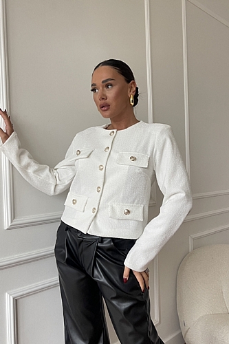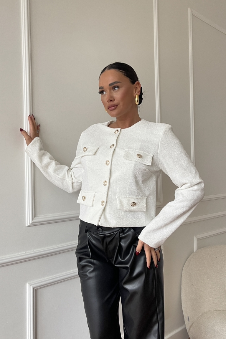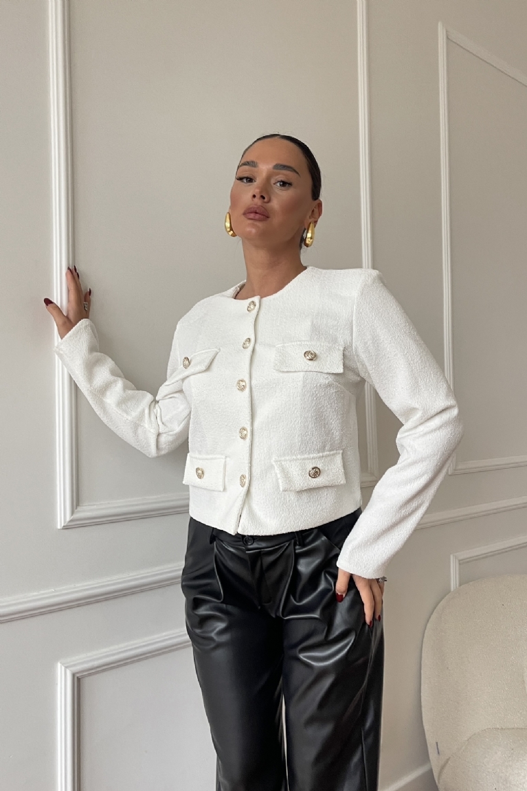 Αναδείξτε το στυλ σας με τη λευκή ζακέτα crop με χρυσά κουμπιά, που προσδίδουν μια αίσθηση πολυτέλειας σε κάθε εμφάνιση.