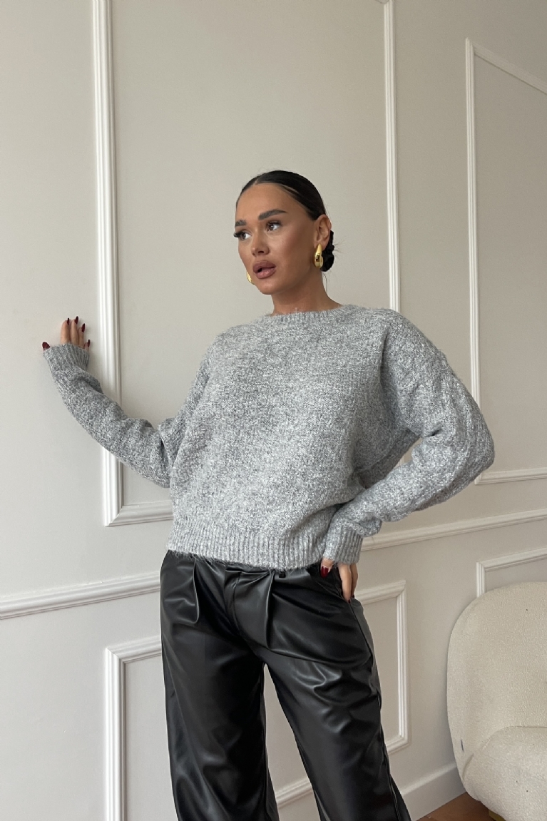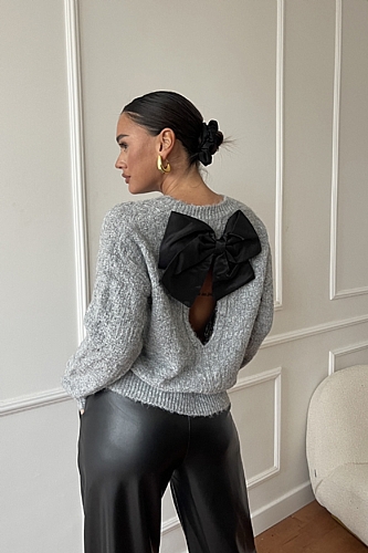 Η πλεκτή μπλούζα σε γκρι χρώμα με εντυπωσιακό φιόγκο στην πλάτη προσθέτει μοναδικό στυλ σε κάθε εμφάνιση.